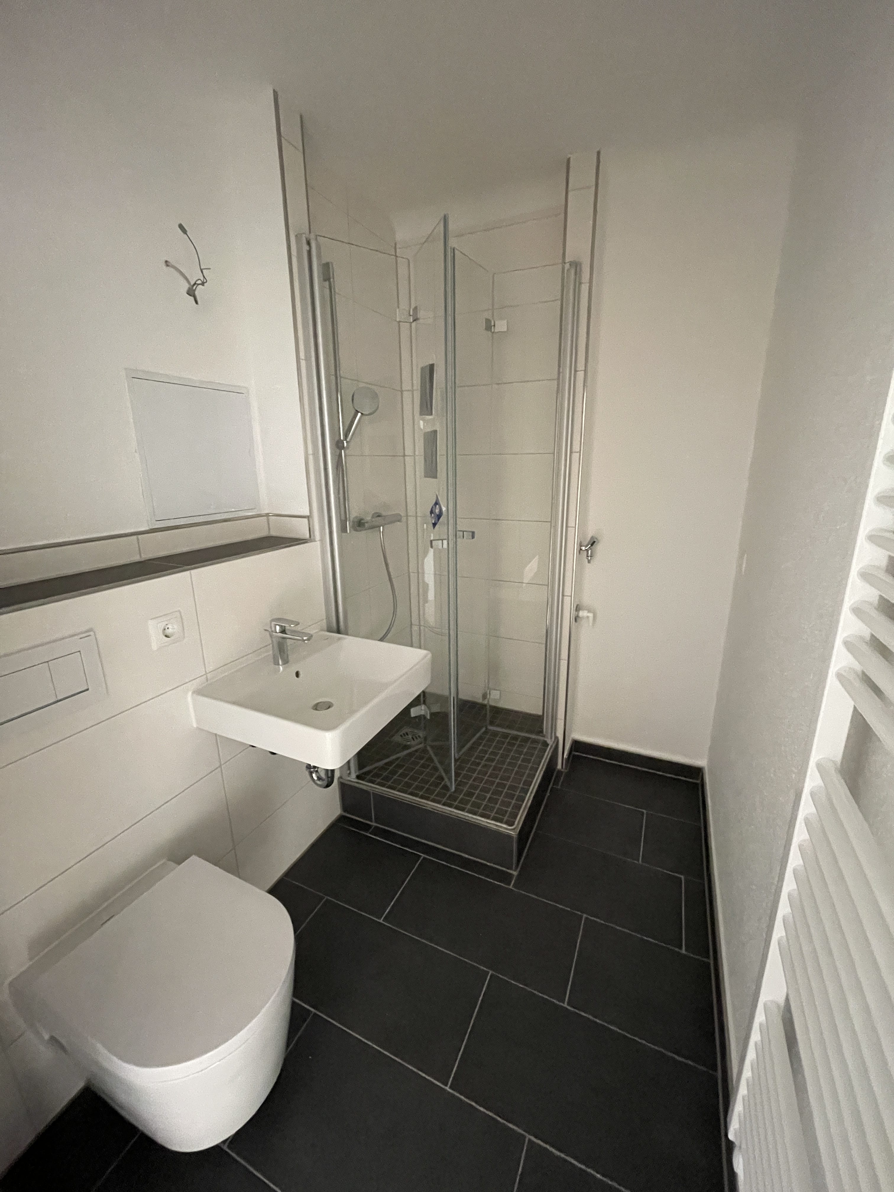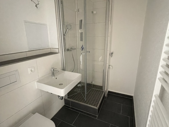Das modern gestaltete Badezimmer ist mit einer großzügigen Dusche ausgestattet. Es handelt sich um ein innenliegendes Bad ohne Fenster, das funktional und zeitgemäß gestaltet wurde.