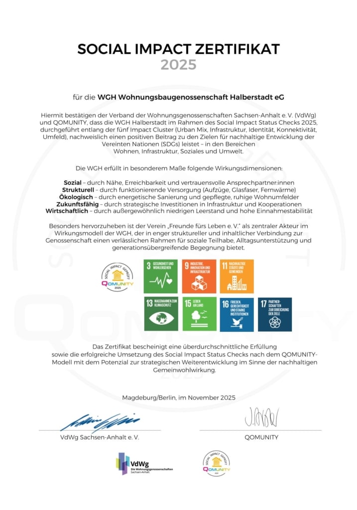 Die WGH – Wohnungsgenossenschaft Halberstadt eG zeigt mit ihrem Social Impact Status Check, wie genossenschaftliches Wohnen soziale, ökologische und strukturelle Entwicklung fördert. Im Fokus stehen fünf Bereiche: Nutzungsmix, moderne Infrastruktur, starke Identität, Vernetzung im Quartier und ein nachhaltiges Wohnumfeld.