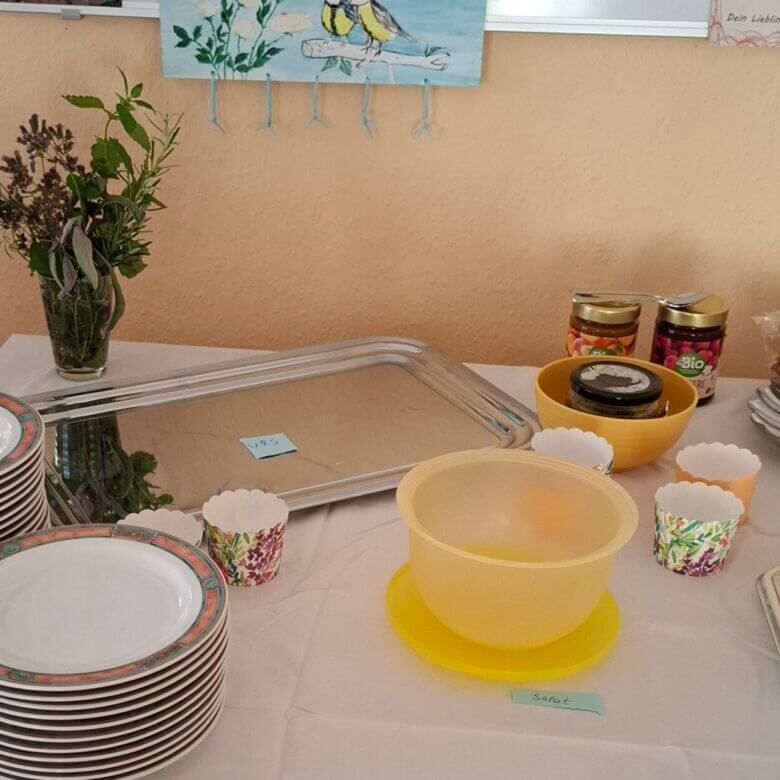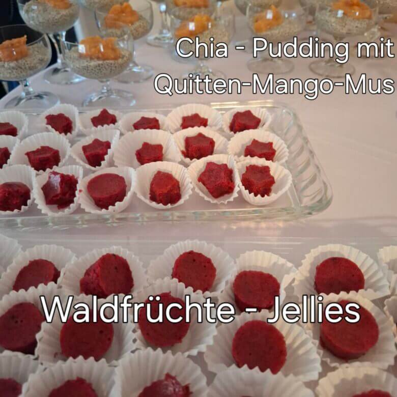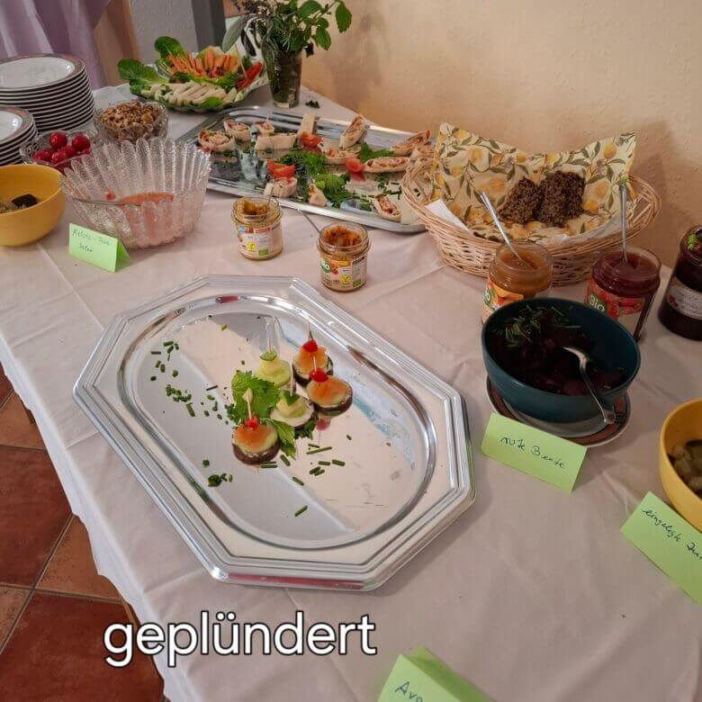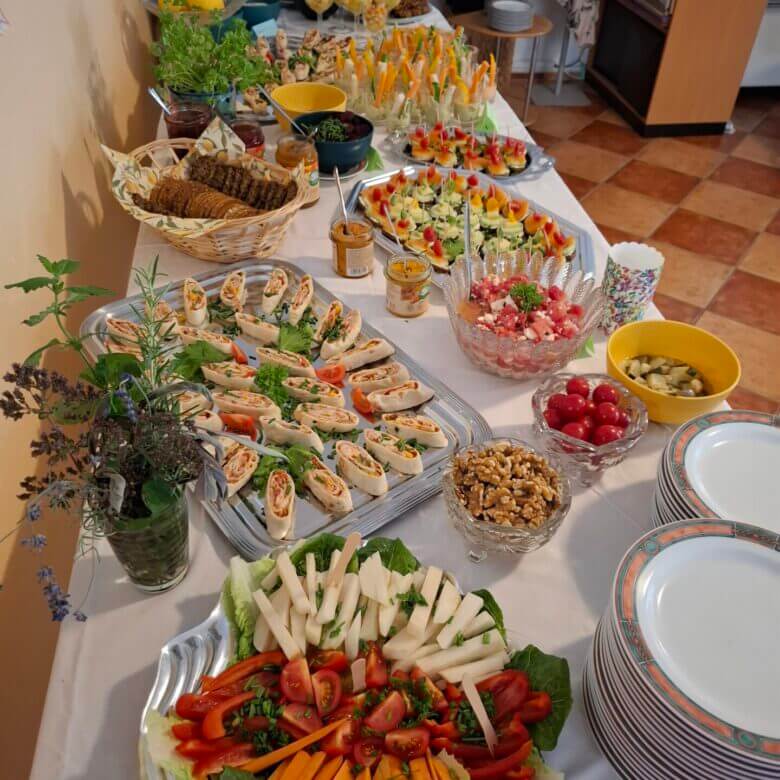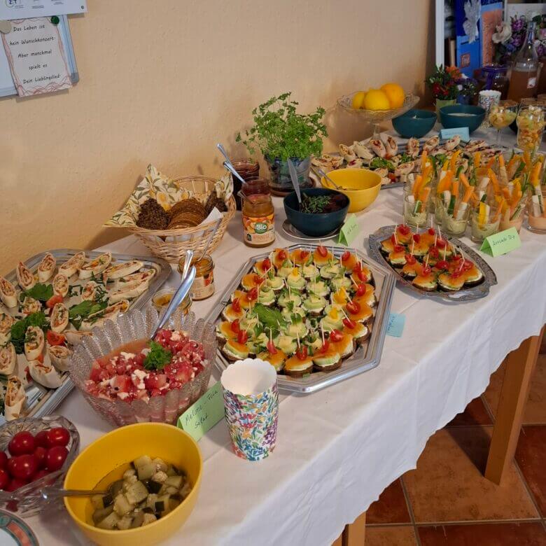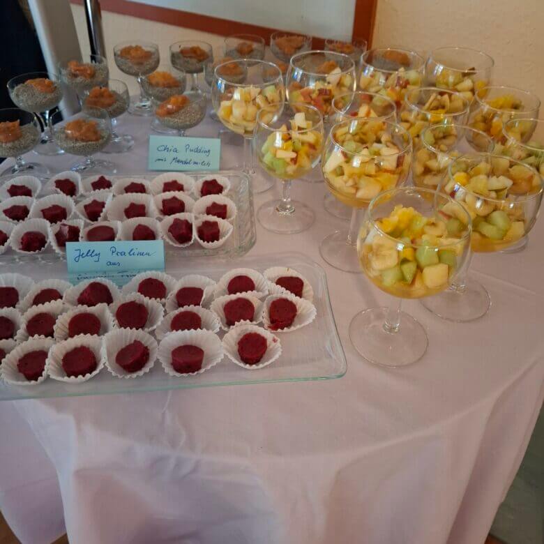 Bereits am Donnerstag begannen die Vorbereitungen für den gesunden Brunch am Freitag. Die angebotenen Leckereien reichten von selbst gebackenem Brot, Haferflockenkeksen und Kuchen, über Miniwraps, verschiedenen Salaten bis hin zu Gemüsesticks. Auch für die Naschkatzen gab es einige Köstlichkeiten zum Probieren. Waldfruchtjellies, Obstsalat, Waffeln, Chiapudding und verschiedene Smoothies. Unser Büfett fand großen Anklang bei unseren Gästen, so dass dann auch alle gut gestärkt ins Wochenende starten konnten.